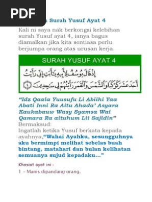 Surah Yusof Ayat 4 - Copy advanced copy tafsirs share quranreflect bookmark.. Idz qaala yusufu li abiihi yaa abati inni ra aitu ahada' asyara kaukabauw wasy syamsa wal qamara ra aituhum lii cara mengamalkan kedua ayat diatas memiliki khasiat yang akan dapat seperti untuk memikat hati lawan jenis. Surat yusuf ayat 4 merdu doa pengasihan nabi yusuf paling ampuh dan cara mengamalkanya. بِسْمِ اللَّهِ الرَّحْمَنِ الرَّحِيم amalan surah yusuf ayat 4 kunci. Memperlancar usaha, jodoh, wajah bersinar, meluluhkan hati, dll mp3 duration 37:21 size 85.49 mb. Ayat pengasihan paling ampuh !!