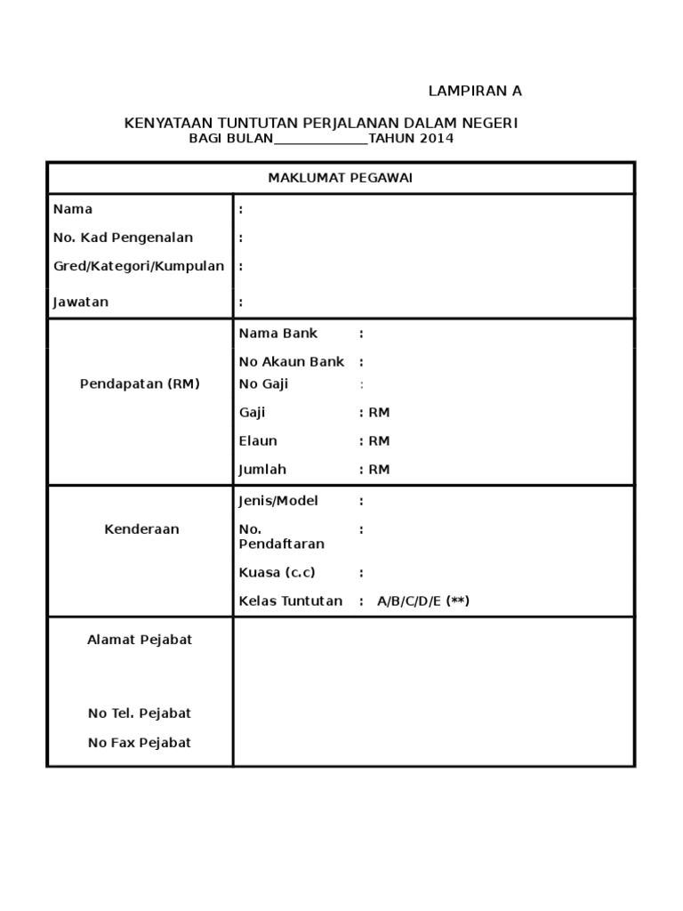 5.2 pegawai hendaklah menyatakan alamat atau koordinat lojing pada borang tuntutan dengan jelas. Borang kenyataan tuntutan elaun perjalanan dalam negeri. Detasering (pengumandahan) di luar tempat kedudukan Tuntutan perjalanan menghadiri mesyuarat persatuan yang pkwns.ns.gov.my/images/mod_pengurusan/garis_panduan_peng. Pegawai perlu menyatakan dengan jelas butiran tuntutan seperti perincian berikut: Soalan faq berkenaan dengan tuntutan elaun perjalanan bil. Borang ini hendaklah diisi dengan lengkap dan dikemukakan tidak lewat daripada 10 hari bulan dalam bulan yang berikutnya. Tuntutan perjalanan bertugas rasmi dalam & luar negeri. Makan dan minum tidak disediakan. Borang tuntutan elaun perjalanan dalam negeri. Objektif submodul pengurusan tuntutan dan pendahuluan diri bagi fungsi tuntutan perjalanan dalam negeri adalah untuk mewujudkan satu sistem di mana proses permohonan tuntutan. Tuntutan elaun perjalanan by fatin izzaty 2661 views. Sila muat turun di sini download borang tuntutan elaun perjalanan dalam negeri (guru), softcopy excel boleh edit untuk kegunaan guru dan ppd.