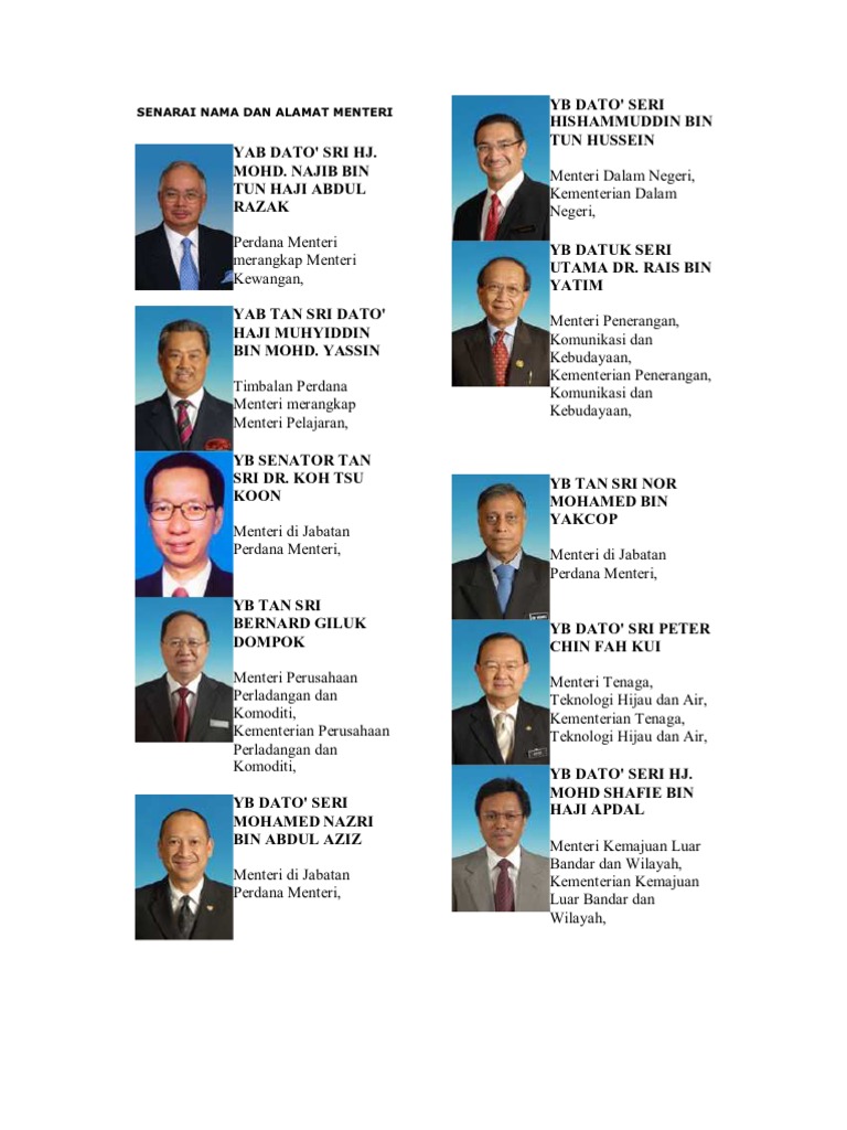 Berikut senarai menteri / timbalan menteri terbaru bagi tahun 2020 yang diumumkan sebentar tadi. Anggota jemaah menteri dan timbalan menteri tahun 2020 (senarai menteri kabinet). Timbalan menteri kemajuan luar bandar dan wilayah, pejabat timbalan menteri, aras 31, no 47 persiaran perdana presint 4, 62100 putrajaya. Mohd yassin was sworn in as the new deputy prime. Apabila pakatan harapan (ph) menang dalam pilihan raya umum (pru) lalu, anwar dinamakan sebagai bakal perdana menteri, sebaik dr mahathir mohamad.