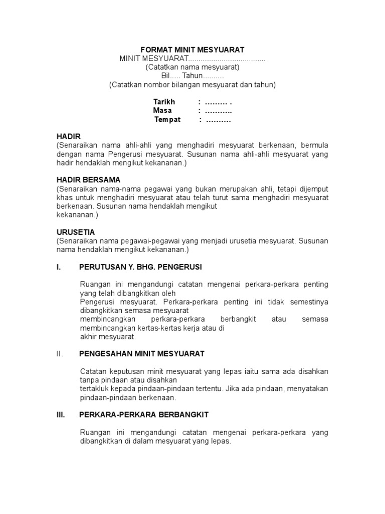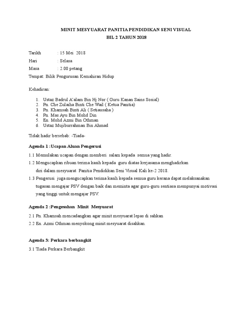 Mohd salleh bin mohd kassim. Dalam erti kata lain, mesyuarat tidak boleh dikendalikan oleh seorang individu sahaja. Mesyuarat kurikulum bil 01/2020 tindakan: Pindaan minit, jika ada, akan dilakukan juga. Minit mesyuarat adalah laporan mengenai perkara yang dibincangkan atau diputuskan dalam sesuatu mesyuarat.